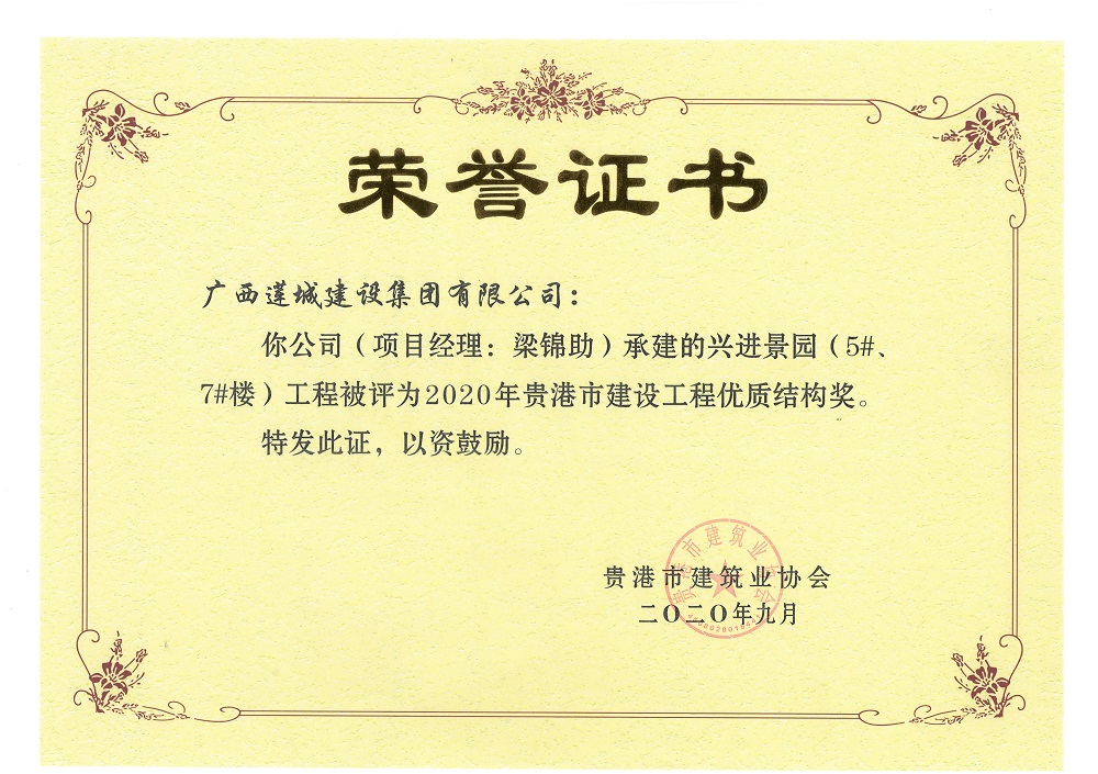 2020年貴港市建設(shè)工程優(yōu)質(zhì)結(jié)構(gòu)獎興進(jìn)景園(5#、7#)工程,項目經(jīng)理:梁錦助