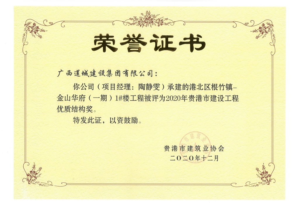 2020年貴港市建設(shè)工程優(yōu)質(zhì)結(jié)構(gòu)獎港北區(qū)根竹鎮(zhèn)-金山華府(一期)1#樓工程,陶靜雯
