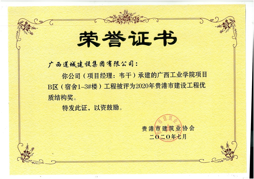 2020年貴港市建設(shè)工程優(yōu)質(zhì)結(jié)構(gòu)獎廣西工業(yè)學(xué)院項目B區(qū)(宿舍1-3#)工程