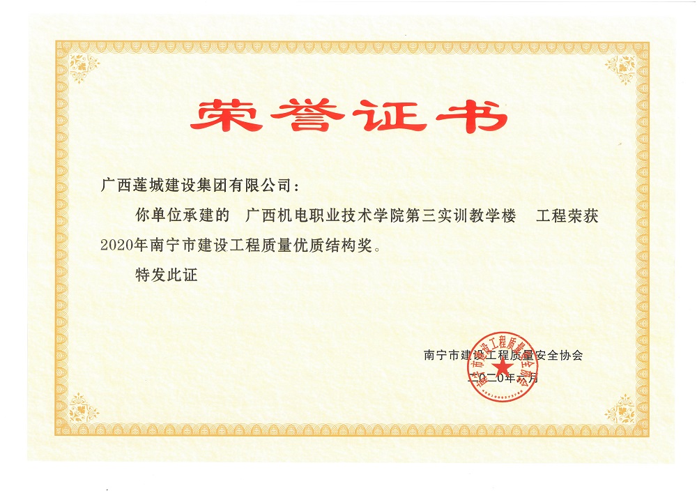 2020年南寧市建設(shè)工程質(zhì)量優(yōu)質(zhì)結(jié)構(gòu)獎廣西機電職業(yè)技術(shù)學(xué)院第三實訓(xùn)教學(xué)樓