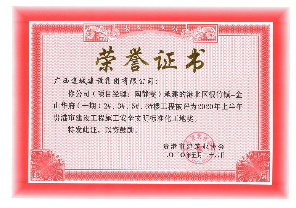 2020年上半年貴港市安全文明工地(市級)港北區(qū)根竹鎮(zhèn)-金山華府(一期)2#、3#、5#、6#樓工程,項目經(jīng)理:陶靜雯