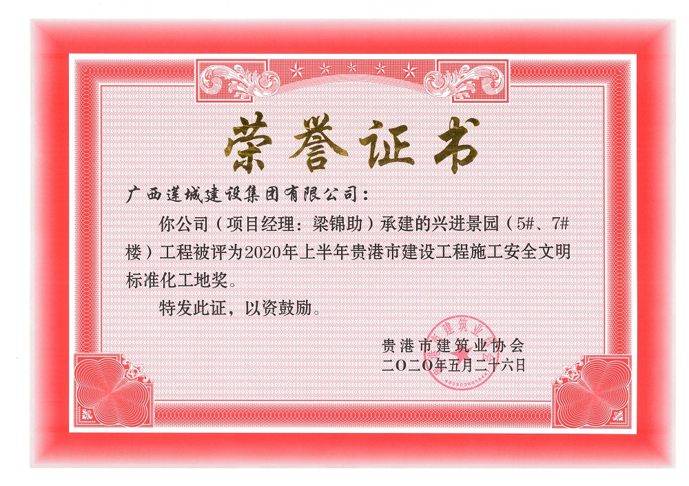 2020年上半年貴港市安全文明工地(市級)興進(jìn)景園(5#、7#樓)工程,項目經(jīng)理:梁錦助