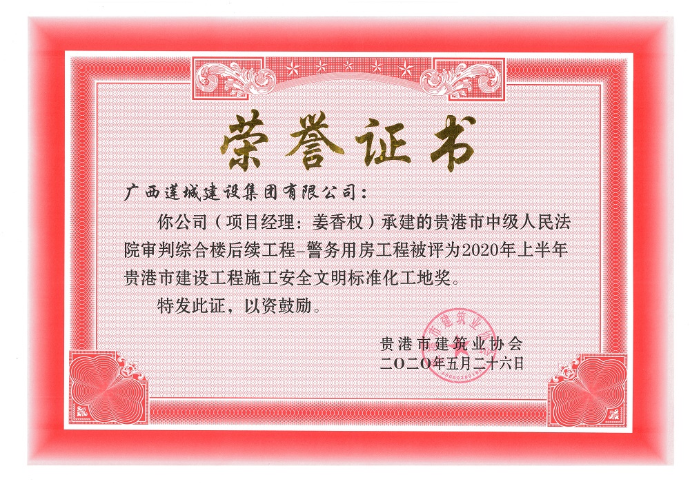 2020年上半年貴港市安全文明工地(市級)貴港市中級人民法院審判綜合樓后續(xù)工程-警務(wù)用房工程,項目經(jīng)理:姜香權(quán)