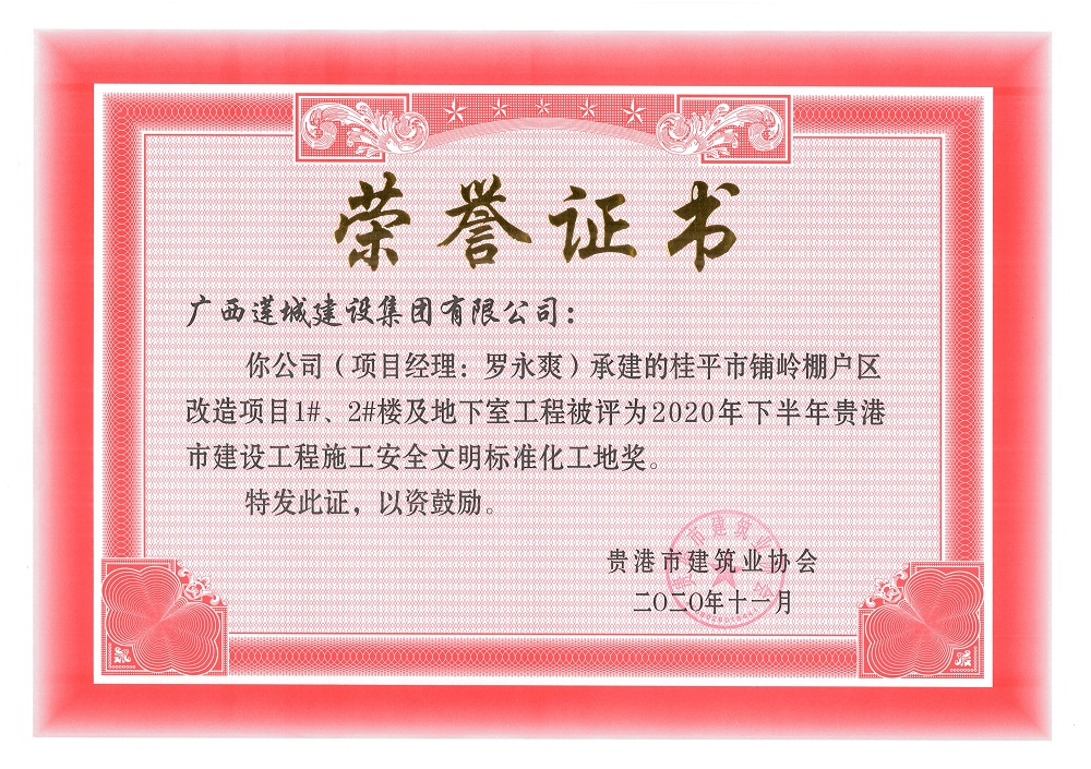 2020年下半年貴港市安全文明工地(市級)桂平市鋪嶺棚戶區(qū)改造項目1#、2#樓及地下室,項目經(jīng)理:羅永爽