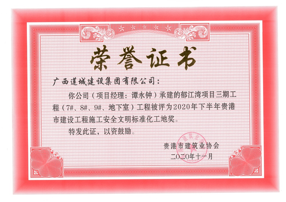 2020年下半年貴港市安全文明工地(市級)郁江灣項目三期工程(7#、8#、9#、地下室),項目經(jīng)理:譚永鐘