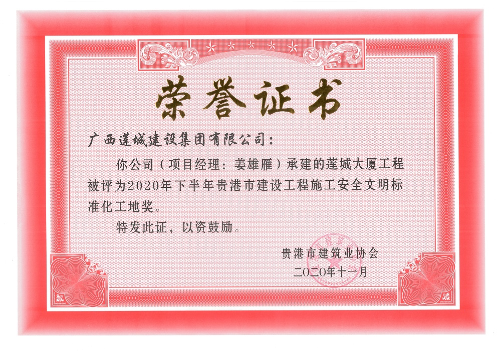2020年下半年貴港市安全文明工地(市級)蓮城大廈工程,項目經(jīng)理:姜雄雁,