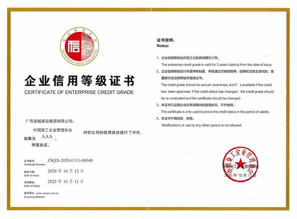 中國企業(yè)信用等級證書AAA