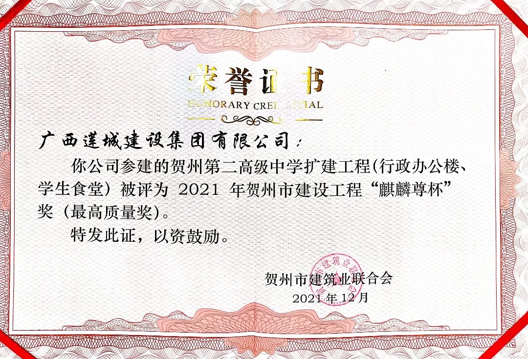 集團公司參建的賀州第二高級中學擴建工程(行政辦公樓、學生食堂)項目榮獲2021年賀州市建設(shè)工程“麒麟尊杯”獎(最高質(zhì)量獎)。