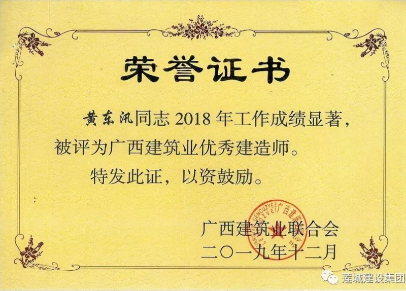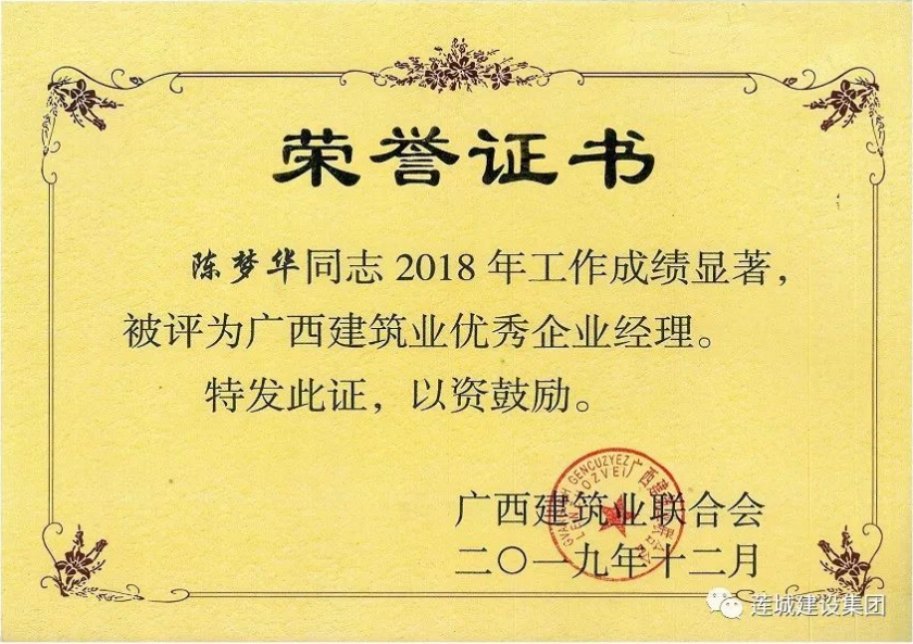 陳夢華總經(jīng)理獲頒2018年度“廣西建筑業(yè)優(yōu)秀企業(yè)經(jīng)理”,黃東汛獲頒2018年度“廣西建筑業(yè)優(yōu)秀建造師”,黃文亮、姜紅華、譚景騰等15人獲頒2018年度“廣西建筑業(yè)安全生產(chǎn)先進(jìn)工作者”。