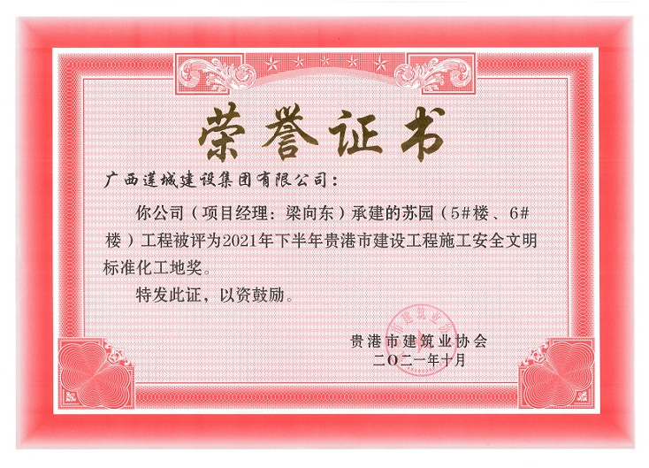 此外,蘇園5#樓6#樓、貴港市西江產(chǎn)業(yè)園科創(chuàng)產(chǎn)業(yè)基地項(xiàng)目設(shè)計(jì)采購施工運(yùn)營(EPC+0)總承包工程等兩個項(xiàng)目獲評“2021年下半年貴港市建設(shè)工程施工安全文明標(biāo)準(zhǔn)化工地獎”。