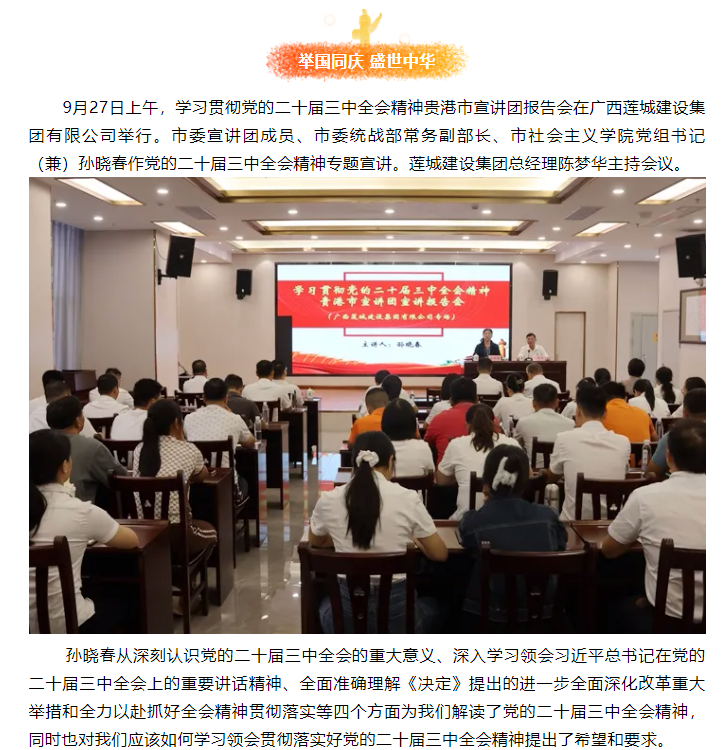 9月27日上午,學(xué)習(xí)貫徹黨的二十屆三中全會精神貴港市宣講團(tuán)報告會在廣西蓮城建設(shè)集團(tuán)有限公司舉行。...