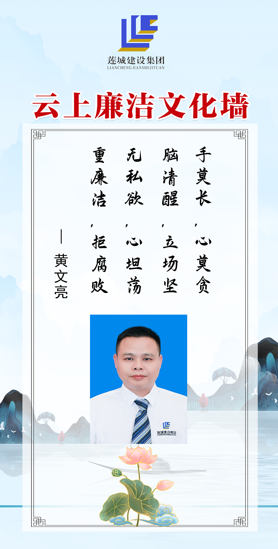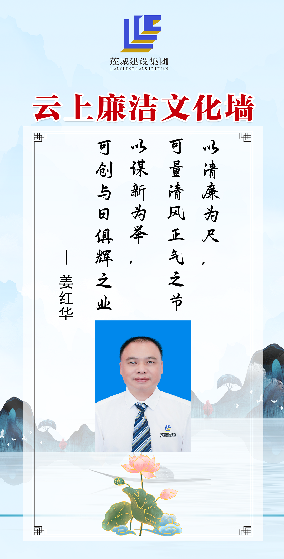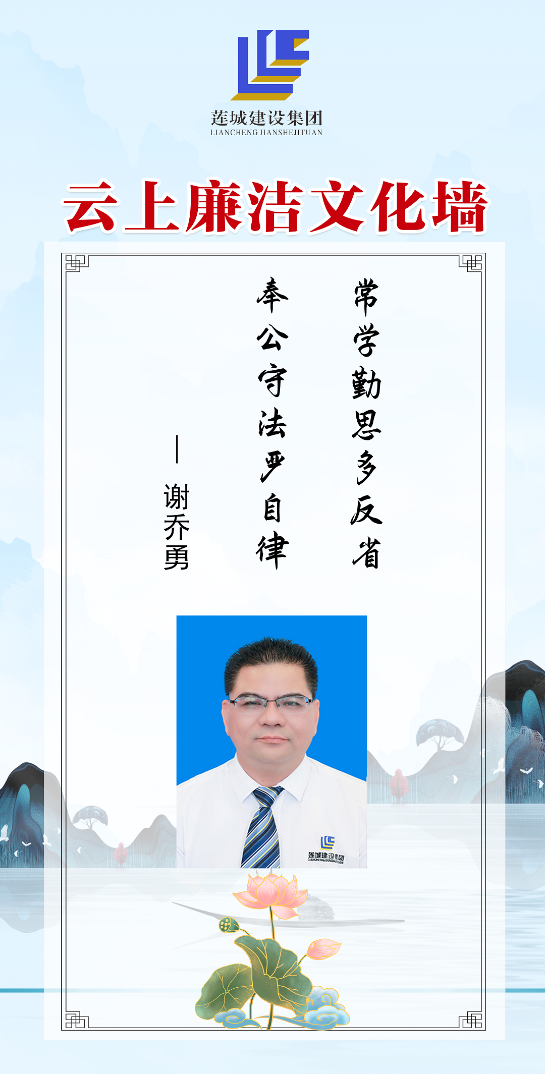 公司領(lǐng)導(dǎo)班子成員以圖文、自述的方式,展現(xiàn)蓮城人積極向上、廉潔自律的精神風(fēng)貌,進(jìn)一步營(yíng)造風(fēng)清氣正、廉潔自律的良好工作氛圍。