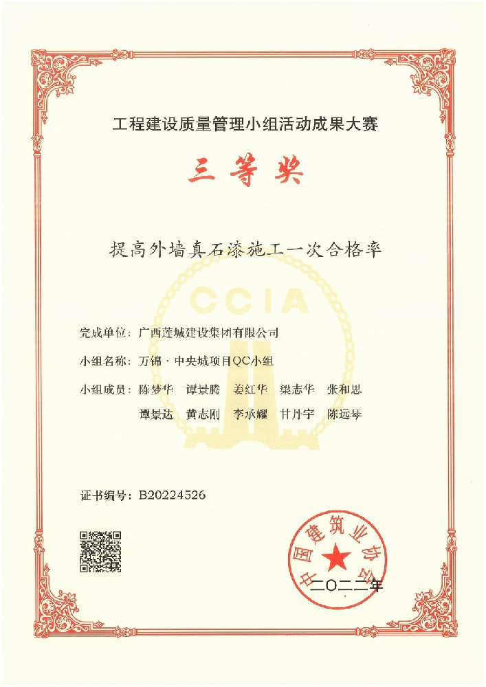 提高圍護(hù)灌注樁施工效率,QC二等獎,貴港市港北區(qū)人民醫(yī)院住院樓建設(shè)項目QC小組成員:黃志剛、陳夢華、譚燕喜、謝喬勇、李承耀、韋建協(xié)、周聲揚(yáng)、覃遠(yuǎn)飛、陶靜雯、劉蕓汐提高旋挖成孔灌注樁施工質(zhì)量合格率,QC三等獎,港南中學(xué)學(xué)生宿舍樓項目部QC小組成員:陳夢華、姜紅華、黃添明、梁志華、陳霖、梁軍、陳熙林、莫智莉、陳遠(yuǎn)琴...