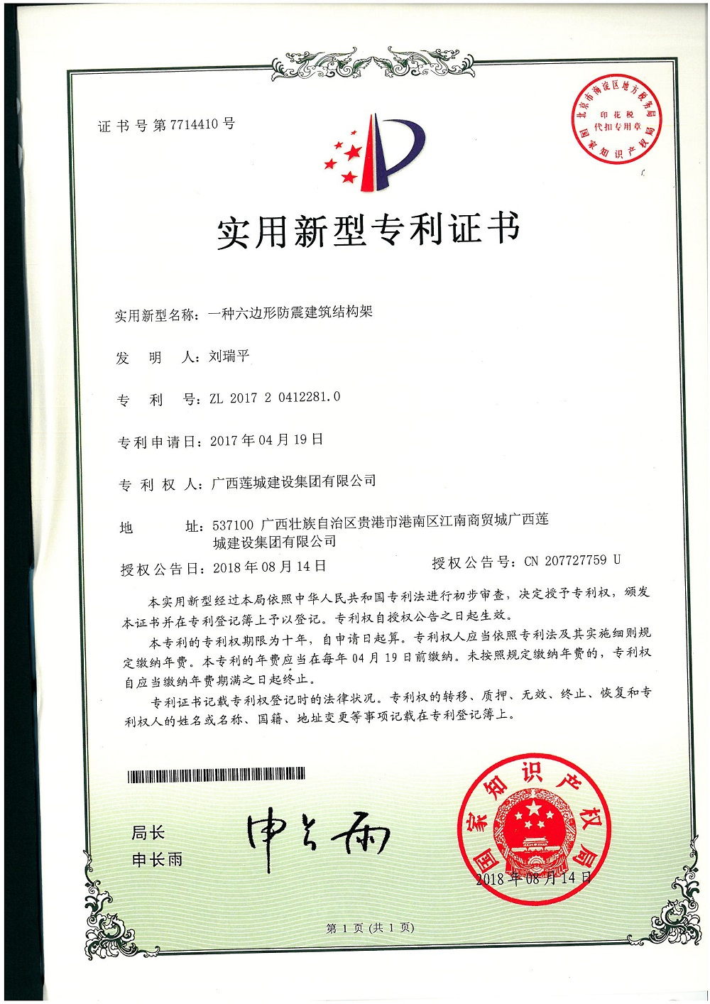 (一種六邊形防震建筑結(jié)構(gòu)架)實(shí)用新型專利證書