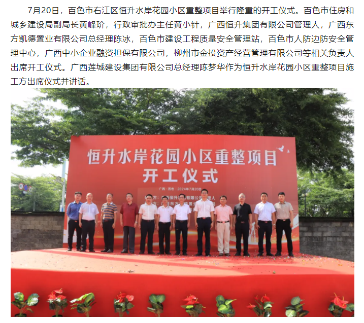 7月20日,百色市右江區(qū)恒升水岸花園小區(qū)重整項目舉行隆重的開工儀式。...