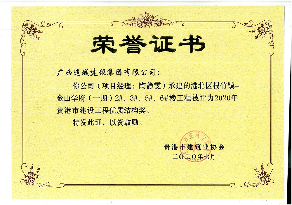 2020年貴港市建設(shè)工程優(yōu)質(zhì)結(jié)構(gòu)獎港北區(qū)根竹鎮(zhèn)-金山華府(一期)2#、3#、5#、6#樓工程,陶靜雯