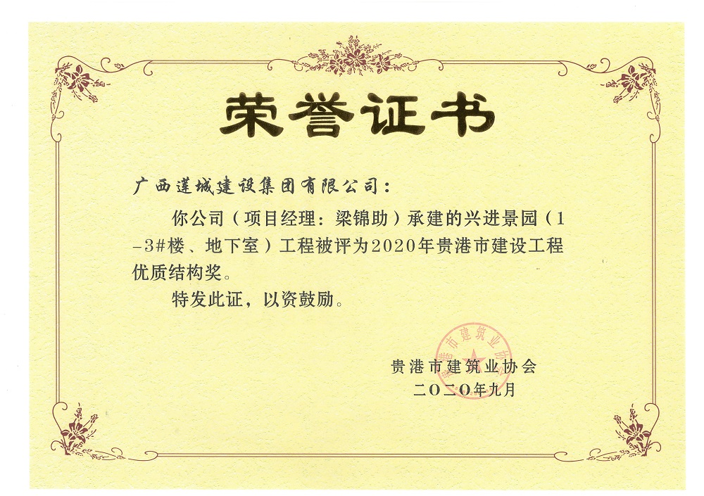 2020年貴港市建設(shè)工程優(yōu)質(zhì)結(jié)構(gòu)獎興進(jìn)景園(5#、7#)工程,項目經(jīng)理:梁錦助