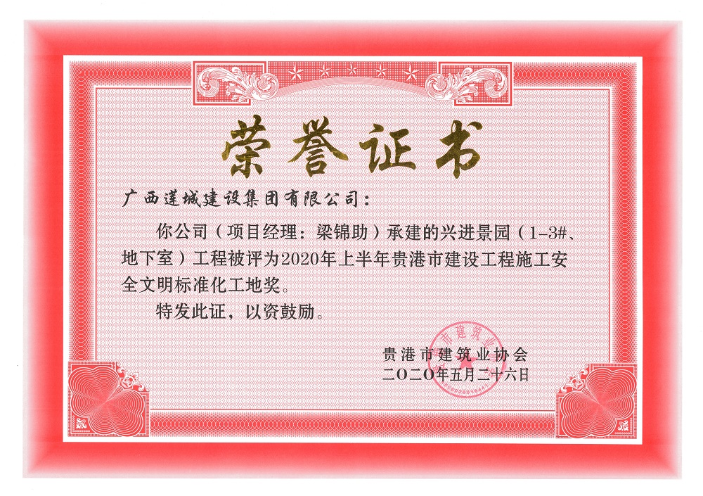 2020年上半年貴港市安全文明工地(市級)興進(jìn)景園(5#、7#樓)工程,項目經(jīng)理:梁錦助