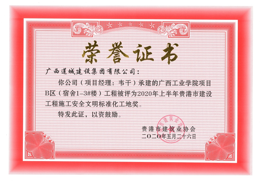 2020年上半年貴港市安全文明工地(市級)廣西工業(yè)學(xué)院項目B區(qū)(宿舍1-3#樓)工程,項目經(jīng)理:韋干