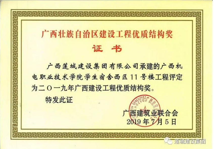 另外,公司“廣西機(jī)電職業(yè)技術(shù)學(xué)院學(xué)生宿舍西區(qū)11號樓項(xiàng)目”榮獲“2019年上半年廣西建設(shè)工程優(yōu)質(zhì)結(jié)構(gòu)獎(jiǎng)”。