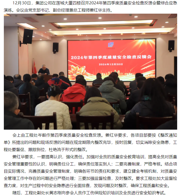 12月30日,集團公司在蓮城大廈四樓召開2024年第四季度質量安全檢查反饋會暨綜合應急演練。...