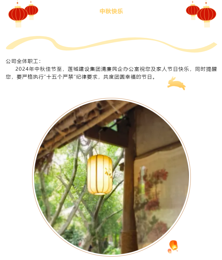 歡度中秋 喜迎國(guó)慶廉潔提醒全體職工:在中秋、國(guó)慶雙節(jié)來(lái)臨之際,蓮城建設(shè)集團(tuán)清廉辦公室向您及家人致以節(jié)日的問(wèn)候,同時(shí)提醒您,要嚴(yán)格執(zhí)行“十五個(gè)嚴(yán)禁”和業(yè)務(wù)支出“七不準(zhǔn)”紀(jì)律要求,共同營(yíng)造廉潔文明、歡樂(lè)祥和的節(jié)日氛圍。七不準(zhǔn)01不準(zhǔn)公車私用、私車公養(yǎng),嚴(yán)禁既領(lǐng)車補(bǔ)又違規(guī)使用公車,嚴(yán)禁公車加油卡、ETC卡...